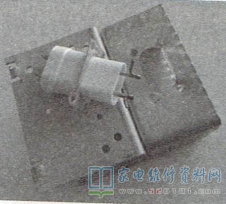 为方便维修磁控管,先拆下磁控管,再用比较薄的水果刀撬开后盖,看到两个引脚各通过一只线圈与磁控管内部的灯丝相连。用斜口钳剪断线圈与插脚连接处(尽量保留线圈原来的形状,因为改变其形状就会改变其磁通量),然后测量引脚与外壳间阻值,仍短路,而内部灯丝并没有与外壳短路。接下来拆卸插脚组件。由于没有电钻,于是用剪刀头代替电钻除去引脚固定孔,如图1所示。