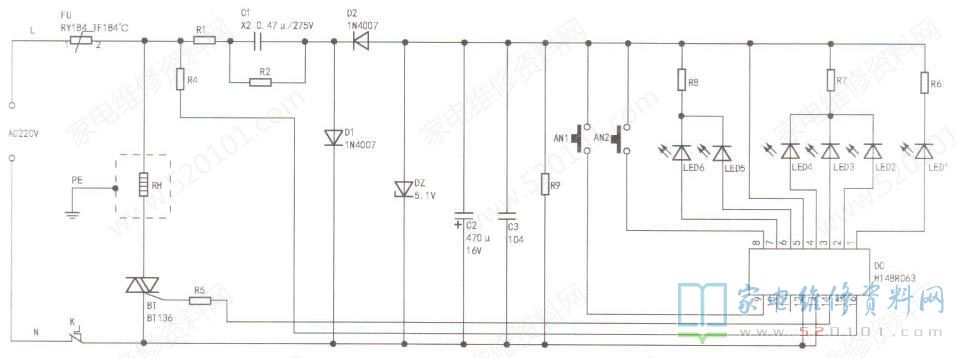 接修一台天际DDZ-7B电炖盅,上电后4个定时设定指示灯轮流点亮闪烁,不加热。为方便维修,特实绘出该电炖盅电路,如图1所示。该机使用的单片机型号为HT48R063,LED1~LED4为定时指示灯,LED5和LED6分别为“炖煮"和“保温”指示灯,按钮AN1和AN2分别是“定时”和“功能”开关。
