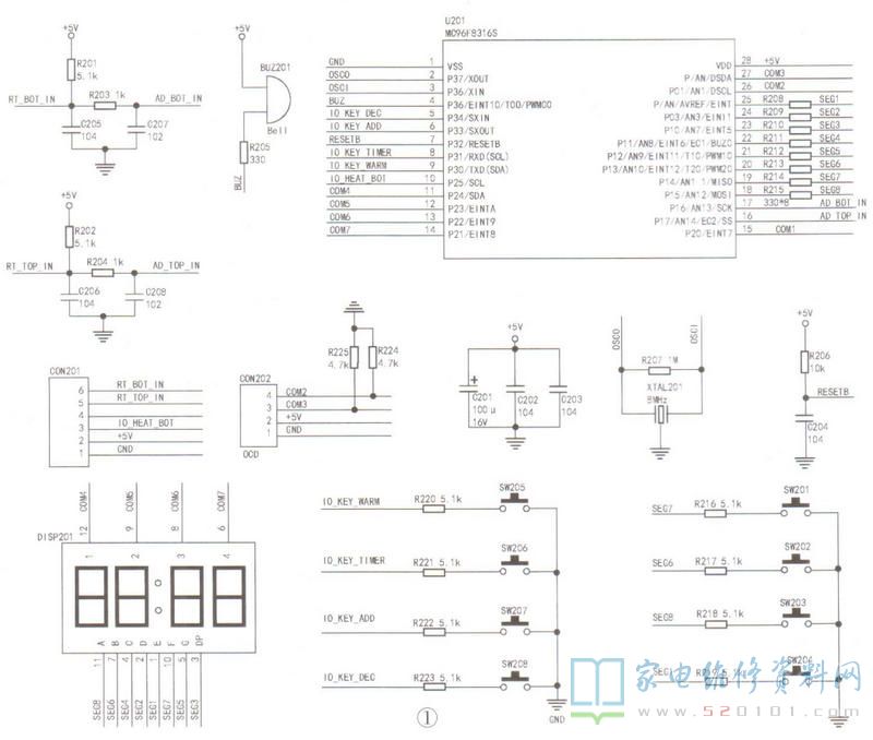 首先测量插座CON201的5V供电,如果正常,则问题出在控制板上(也叫灯板或按键板);如果不正常,则检查电源板。CON201中有6根插针,功能分别是GND(地线) +5V(供电)、RLY (电源板继电器控制信号)、X (空脚)TOP(上传感器信号输入)和BOT(下传感器信号输入)。