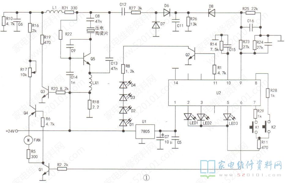 当按下K2键时,U2的⑥脚输出高电平,Q1导通,风扇(FAN )运转;此时Q1的c极为低电平,其c极电流通过R17、R16、L1、R21、R22加到Q5的b极,Q5和外围元件组成一个高频振荡器,接在其c极上的压电陶瓷片在交流脉冲驱动下开始工作。