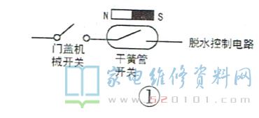 例1:一台松下XQB45-Q420U型全自动波轮洗衣机,洗涤排水正常,进入脱水程序后脱水桶不转。分析检修:前一位维修人员先后更换了洗衣机的门盖安全开关、电脑板,但故障依旧。后来断开排水电磁阀、电动机与电脑板的连线,给电磁排水阀与电动机外接电源,脱水桶转动正常,于是判断新换的电脑板有问题,但换新后仍无效。该机的脱水控制开关有两个:一是安装在门盖左后侧的普通机械开关,当关闭门盖时,安全开关触点闭合;当打开门盖时,安全开关触点断开。第二个是与上述机械开关串联的干簧管开关,如图1所示。干簧管装在洗衣机电脑控制板上,与装在洗衣机门盖前端的磁体配合,当洗衣机门盖闭合时,磁体靠近干簧管,干簧管导通;当洗衣机门盖打开时,磁体远离干簧管,干簧管内触点断开。经查,该机门盖前端的小磁体已脱落,找到小磁体并安装好后通电试机,故障排除。