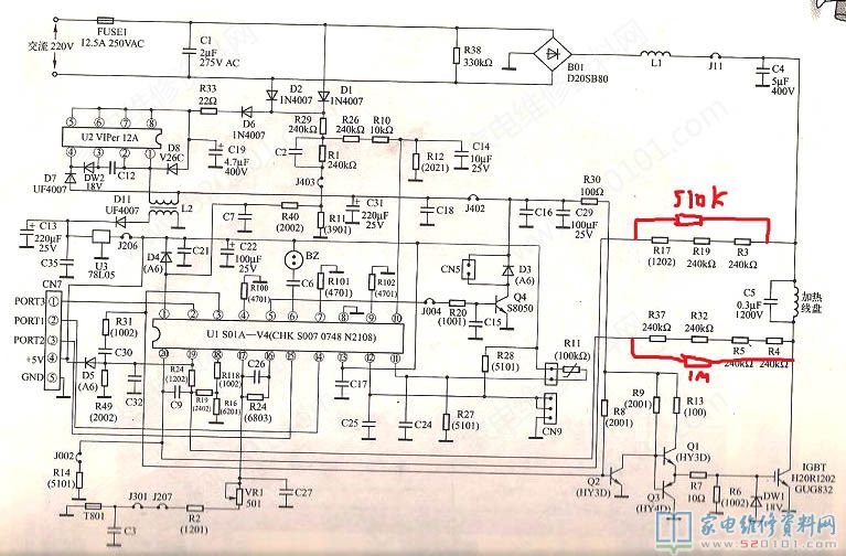 最近接修一台美的sh1982电磁炉,用户刚拿来时报警不加热,拆开电磁炉测量电阻R3开路,更换上去之后,谁知第二天用户又拿来说是老毛病,再次测量让R3、R19、R17结果正常,测量R4、R5、R37、R32都正常,上机可以加热。