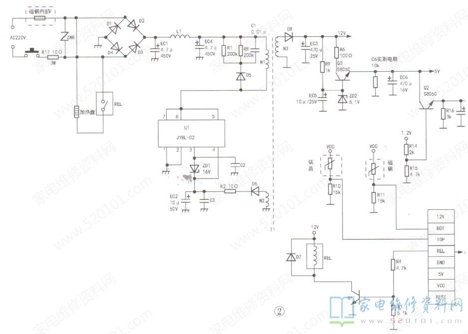 热端N2绕组产生的交流电压经二极管D整流、电容EC2滤波,产生约16.5V直流电压作为U1的二次供电和取样电压。冷端N3绕组产生的交流电压经二极管D8整流、电容EC3滤波,产生12V直流电压。Q3、ZD2等元件组成5V串联稳压电路,输出5V直流电压。在12V电压正常的前提下,Q2导通,输出VCC(5V),供给磁钢内温度检测电路、锅盖温度检测电路和面板。上电测12V、5V输出端电压均为0V,断电后测12V输出端对地无短路现象,这说明故障在热端。测U1的⑤~⑦脚电压为300V,正常;检查U1外围电路,未见异常,判断U1不良。更换U1后试机,故障排除。