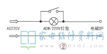 故障现象5:保险管容断。分析检修:此故障俗称爆机,损坏的元件除保险管外,通常还有IGBT管击穿、全桥BG1短路,甚至还有IGBT管驱动电路中某元件损坏,或者CPU的10端口损坏等。实修时,可先将数字万用表置于二极管挡,用红、黑表笔分别接IGBT管的G、e极(IGBT管两侧的引脚),若万用表中的蜂鸣器鸣叫,则说明IGBT管已损坏;否则,说明IGBT管正常。对于全桥的检查,同样用二极管挡,将红表笔接全桥-极,黑表笔分别接AC两脚,若万用表读数均在0.4-0.8之间,则表明全桥正常;否则,表明全桥已损接下来检查滤波电容C13与谐振电容C14,+18V供电电压以及IGBT管驱动电路。更换损坏元件后试机,为防止再爆机,可在电磁炉的电源输入端(或在保险管处)串入一只40W/220V灯泡,进行限流,如图2所示。