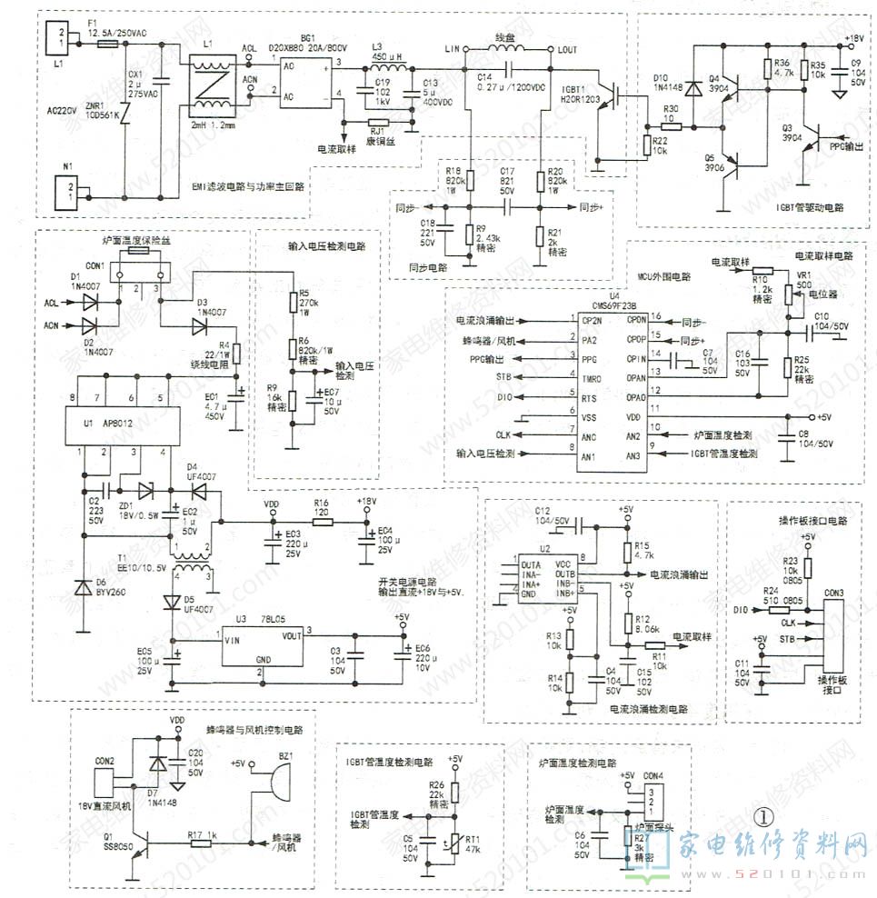 U1 (AP8012)、ZD1、T1 等元件构成开关电源电路,输出+18V和+5V两组直流电压,其中,+18V电压供风扇电机、蜂鸣器和IGBT管驱动电路;+5V电压供给单片机(MCU,U4 )和温度检测电路。