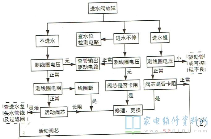 由于上述故障有可能是水位检测电路、进水阀输出驱动电路或自来水管线等发生故障造成的,所以也用虚线框标注在图2中,检测时可参照。