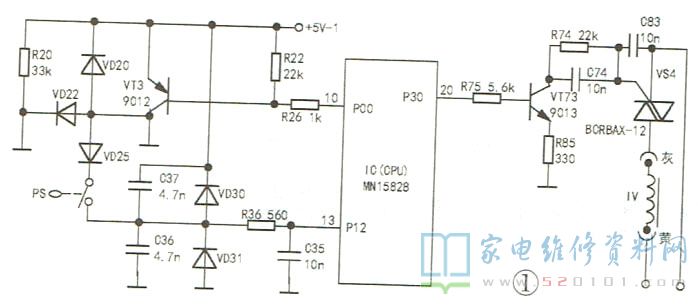 (1)若通电后进水阀IV线圈两端无AC220V电压,一种可能是水位开关PS(见图1)触点短路或积垢漏电,CPU 13脚收到的水位信息,使CPU误判为桶内水已加满,禁止20脚输出高电平,导致电磁阀IV不能开启进水;另一种可能是CPU及水位检测电路都正常,20脚虽已输出高电平,但因R75、R74、R85、C74、C83、VT73、VS4脱焊开路或失效,导致电磁阀IV无电而不能开启;