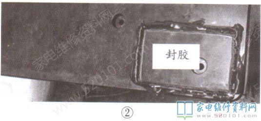 一台小天鹅TB65-C1208H型全自动洗衣机,,在洗衣状态时不进水。单独脱水时功能正常。分析检修:拆出电脑板,上电启动,用万用表测量进水阀的两根电线,无AC220V电压。断电后测量进水阀的线圈阻值约为5k,正常,说明问题出在电脑板上。除去进水控制电路上的封胶,测得进水阀可控硅已损坏。更换可控硅后试机,故障排除。为防止电路受潮,用705胶封住进水控制电路,如图2所示,最后交付用户使用。