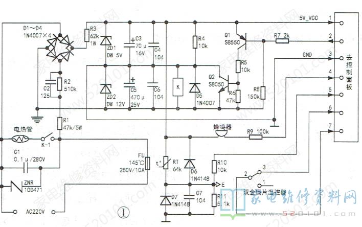 接修一台美的MY-CD50电压力锅,饭未煮熟便自动停止加热。这是一款早期产品,锅盖未设温度传感器,锅盖与锅体为可分离式结构,没有任何电气连接。锁紧锅盖便是压力锅,不锁紧或不加盖便可作为普通电饭锅使用,兼有压力锅和电饭锅二者的功能。加水加电,按下“煮粥”键观察,发现控制与加热均正常,但水未烧开(约80°C )便停止加热。查看锅的内胆无污渍、变形现象,与发热盘接触也良好,判断故障点在温度检测电路中。实绘电源板电路如图1所示(元件位号为笔者所加)。
