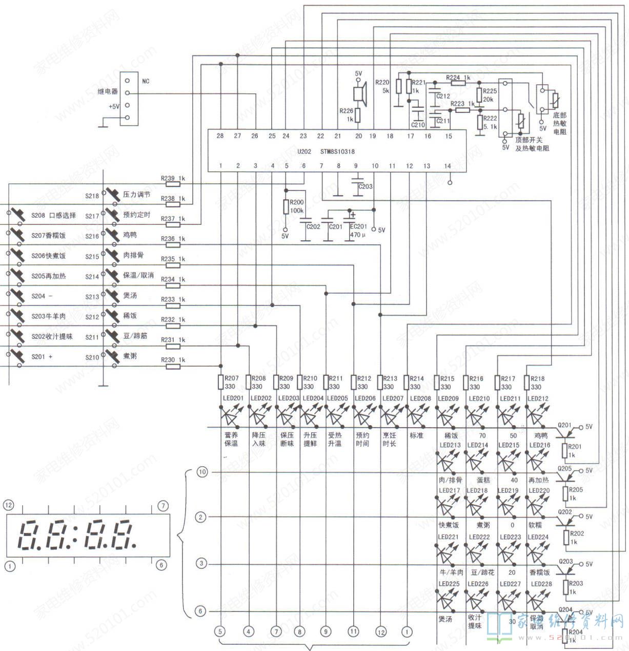 仔细观察故障时,机器除了显示“50"字符,“鸡鸭”模式的指示灯也在闪烁,根据这个特征,怀疑“鸡鸭”模式的按键开关S216有漏电情况,但测量开关绝缘电阻阻值正常。将S216拆开后发现里面的触点之间有污物,怀疑是厨房油烟环境所致。将其内部清洗干净后复原。再试机几天,故障不再出现。故障时显示的“50"字符,其含义是“鸡鸭”模式的厂家设定时间。因按键开关S216触点间有污物漏电,所以引起上述故障现象。该电压力锅实测电路如图1、图2所示。
