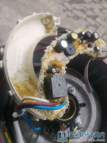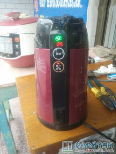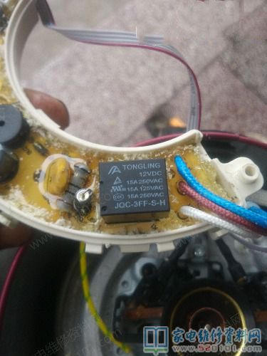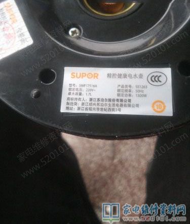 接修一台苏泊尔SWF17S16A电水壶,故障表现为显示操作正常不加热故障,打开底盖目测判断继电器坏,但此继电器被胶灌注,一时也难以代换,况且只是推断还不是确诊,保险起见还是按步就班,拆开手柄查电控加热驱动信号随烧水指令有5∨输出,果断拆下换上个15A的继电器装上试机正常(原机10A/250V继电器,1300w发热底盘)。