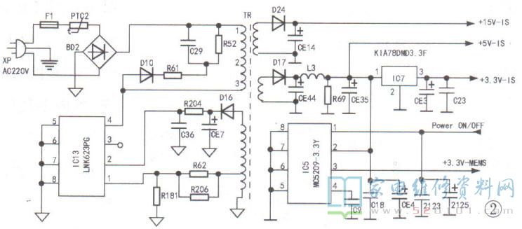 开关变压器次级产生两种电压:+15V-IS为控制继电器RY15供电;+5V-IS为两个3.3V稳压器供电,其中IC7(KIA78DMD3.3F)是普通稳压器,为副CPU(副微处理器型号为:MC9S08A48)提供+3.3V待机电源,而IC5(MC5209-3.3Y )则为受控稳压器,当其①脚输入的电源控制信号( POWERON/OFF )为开机(ON )信号时,③脚输出+3.3V-MEMS电压,为MEMS电路提供+3.3V工作电源。当①脚输入关机(OFF)信号时,③脚无+3.3V-MEMS电压输出。待机控制电路如图3所示。