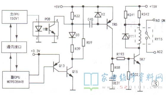 主CPU(T5CV1)工作后,输出控制电压(MAIN-WATCH-D0G )使光耦合器PC8导通,利用C45为TR5提供导通电压,继而TR7导通,使继电器RY15维持吸合状态。此时,副CPU通过通讯接口电路检测到主CPU已输出控制信号后,就不再输出控制信号,RY15内触点闭合仅由主CPU进行控制,完成从待机一启动工作的转换。