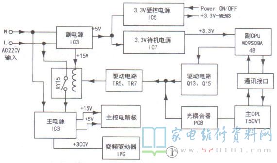 副电源正常工作后,副CPU获得+3.3V工作电压,控制电路处于待机状态,此时放大管Q13.Q15和开关管TR5、TR7均截止,继电器RY15为释放状态,其常开触点断开主电源电路IC3 (BD671FVM-GTR )等的交流供电电源,整机处于待机状态;当需要洗涤时,按动“启动"键(ON/OFF),副CPU收到启动指令后,输出控制电压,经带阻三极管Q13.Q15放大后,再通过R39、D3、C45使RT5导通,TR5集电极输出电压经R193.R202分压限流后使TR7导通,继电器RY15线圈得电吸合,其常开触点被联动闭合,将AC220V市电送至主电源电路,主电源产生三种电压: +300V为变频驱动器(IPG )供电;+15V和+5V为主控电路供电,使变频洗衣机处于整机工作状态。