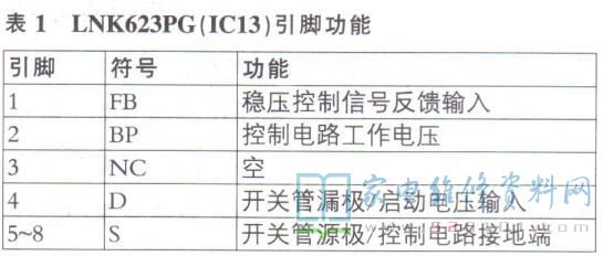 三星WF1700/1800系列变频洗衣机有WF1700/WF1800、WF1702/WF1802、WF1704/WF1804、WF1708/WF1808等机型。与众不同的是,该系列洗衣机设置了待机控制电路及与其配套的副电源电路。待机控制原理框图如图1所示,副电源电路如图2所示,是以开关电源芯片IC13 为核心构成的变压器耦合并联型开关电源,IC13的型号为LNK623PG,引脚功能如表1所示。
