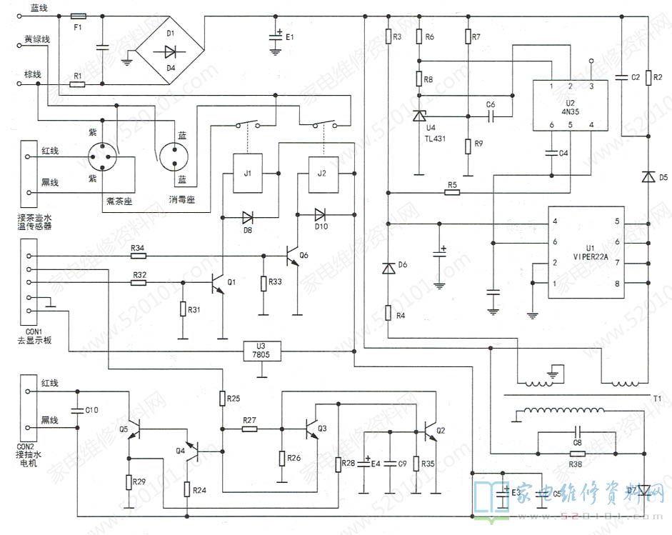 接修一台金灶T300电热茶艺炉,接通电源后开机,数码管显示正常,加热、消毒也正常,蜂鸣器也响,但是加水泵不受控制,一直处于抽水状态。开机后数码管显示,加热、消毒都正常,这说明其交流开关电源电路、加热与消毒控制电路都正常,判断故障在抽水控制电路中。该机电源板电路如图1所示。拆开后盖,目测电路板上没有元件烧黑异常现象,接着测量抽水泵控制三极管Q2~Q5,发现Q5的c、e极短路,找来一只同型号(D882)三极管换上后,故障排除。