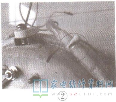 拔下电源插头,用万用表R X 10k挡测量,发现L1与PE端之间的电阻均为80k,即存在漏电现象。橇开手柄盖板及底盘进一步检查,发现加热管引出线的部位未完全密封住,如图2所示,并且杯底部也比较潮湿。先用吹风机吹干此处,再用704密封胶将加热圈引出线裹住。待密封胶干后再测L1与PE端之间电阻,阻值为∞。装机上电,故障排除。