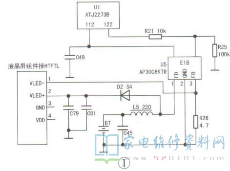 一台“跟着走K637"型看戏机屏幕碎裂,更换屏组件(型号:XCY-FC043TFTQC40A )后开机,屏不亮,也无任何显示。该机板号为K637 REVA03,主控芯片采用炬力ATJ2273B。在开机状态下,测量屏组件上的背光灯供电电压仅为3.9V,约等于电池电压。该机背光灯供电端VLED+.VLED-通过液晶屏组件接口TFT1与芯片U5相连,相关电路如图1所示。