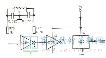 惠尔浦WI6065S型全自动波轮洗衣机采用三线式水位传感器,内部有一个线圈(直流阻值约20Ω )和两只0.022uF电容,如图1所示。4069是一块数字电路,内有6个反相器,本电路只用到其中2个。4069的②、③脚内部和水位传感器组成一个振荡器,无水时产生频率为25kHz、峰值为3Vp-p的正弦波,水位升高后振荡频率降低。4069的⑧、⑨脚内部的反相器起缓冲放大作用。4020是一块14级二进制分频器,对①脚输入的信号进行分频整形,然后从⑤脚输出一个较低频率(实测约40Hz )的矩形波,CPU根据这个矩形波信号的频率变化来判断水位的高低。