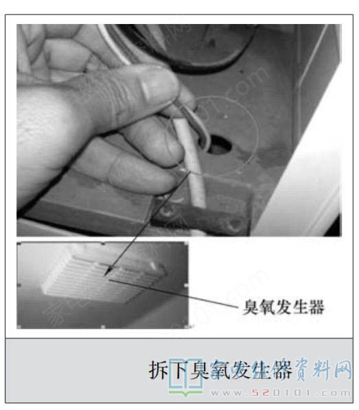 8)拆下消毒柜中的臭氧发生器连接线和上盖,拆下臭氧发生器(如图8所示)。安装时按上述拆机过程的相反顺序装上饮水机即可。