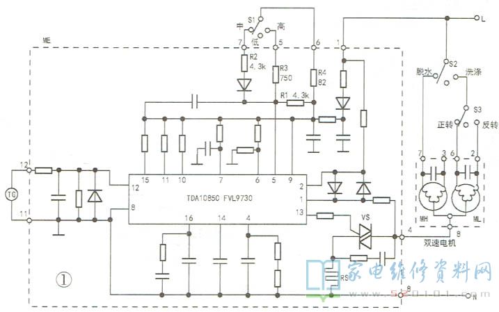 图1所示电路为小鸭XQG50-428G型滚筒洗衣机,采用的是双速电机分级调速控制原理,其中ME(框线内部电路)为调速电路板,ML为双速电机低速(正、反转洗涤)绕组,MH为双速电机高速(脱水)绕组,TG是测速马达,TG与ML或MH同步转动。S1~S3为电动程控器的触点开关:其中S1为速度选择开关,S2为洗涤/脱水开关,S3为洗涤正、反转控制开关,它们共同组成调速控制开关组。