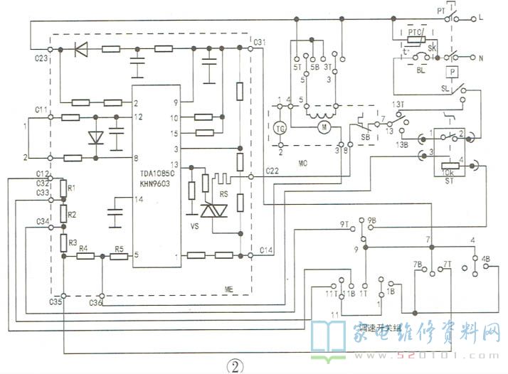 (2)ME板转速设定元件不良,如R1~R4焊接不良导致阻值增大,TDA1085C⑤脚虛焊接触电阻变大,双向可控硅VS导通性能变劣等。