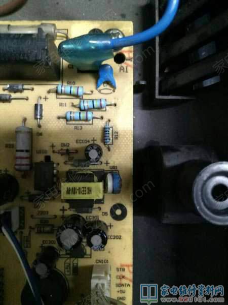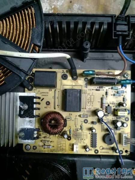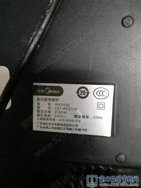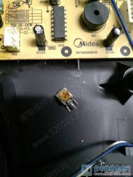 接修一台美的C21-RK2106电磁炉,用户说半天烧不开水,拿到店里通电试机,指示灯、风扇均正常,就是无故障代码,仔细听有不断检锅的滴声,于是断电拆机检查,经查18V、5V电源正常,根据以往经验判断VR1可调电阻(105的) 可能坏了,焊下测量断路,由于手头上没有,拆旧板上的装上试机一切正常。