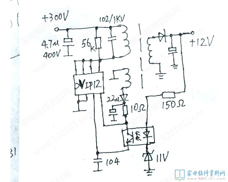 决定改装电路,找出一个电磁炉用电源模块(只需改动一只元件,就可使其输出变为12V),但转念一想,电磁炉模块是热地,而原机电源设计为冷地。何不用常用的Vip12A改电路代替!可能有些师傅会采用更简单的方案,就是用10V的小变压器来改,我之所以不用这种方法,是觉得变压器体积较大,要另找地方安装固定。