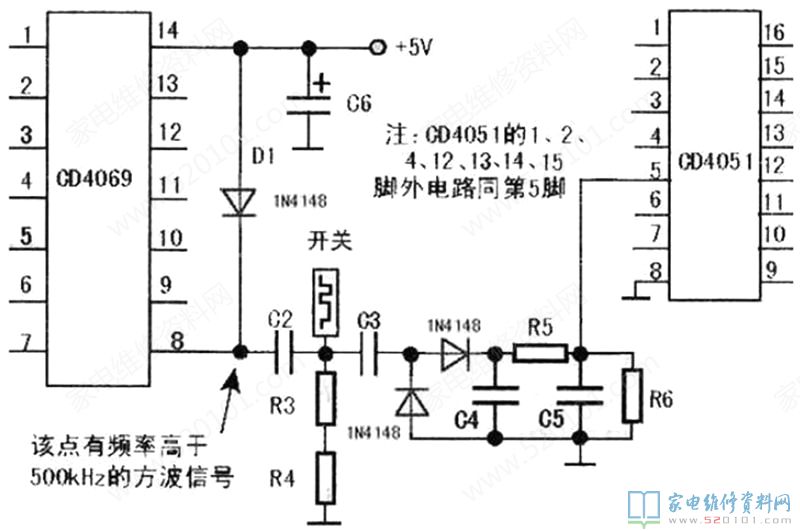 本电路如下图所示,CD4051的1、2、4、12、13、14、15脚外电路同第5脚。图中箭头标注的点位,该点有频率高于500kHz的方波信号。