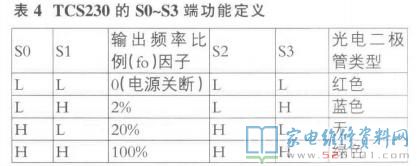 TCS230的供电电压为2.7V〜5V,输出数字信号,可直接驱动标准的TTL或CMOS逻辑电路,即可直接与微处理器或其他逻辑电路相连接,并且每个彩色信道具有1()位以上的A/D转换精度,其外围电路非常简单,如图24所不CTCS23O的3(卜S3端为设置端,通常与单片机相连,SO和S1用于设置输出频率比例因子(TCS230的典型输出频率范围为2Hz〜500kHz)。输出频率比例因子可使颜色传感器的输出能够适应不同的测量范围,提高它的适应能力,例如:当使用低速的频率计数器时,就可以选择小的比例因子,从而使TCS23O的输出频率和计数器相匹配。S2和S3用于选择光电二极管类型,对应关系见表4。