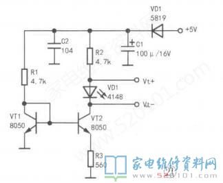 电路采用5V供电,VD1为传感器探头。在VD1温度为15°C时,测得Vt+、Vt-电压分别为4.16V,3.66V;在VD1温度为75cC时,Vt+、Vt-电压分别为4.16V、3.52V。