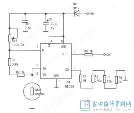 若HW2未接收到红外信号,IC1⑤、⑨脚为低电平,其⑥、⑧脚为高电平,VT4截止,信号输出端(OUT)输出高电平(电压约为3.8V)OVD2、R16、R10、C8组成延时电路,调节KI6可调节延时时间长短。