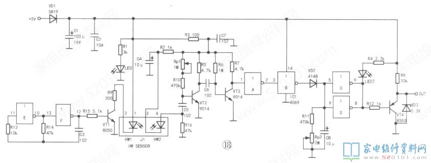 该电路的工作电压为5V、72V,典型值为5V。集成块4069(IC1)内置6个反相器JC1EJC1F、R13、R14、C3组成自激多谐振荡器,产生方波。当有物体位于传感器上方有效距离内时,在三极管VT1的驱动下,HW1发射红外脉冲信号,经障碍物反射后,光敏二极管HW2接收红外脉冲信号,并将其转换成电压脉冲信号,先经VT2和VT3两级放大,再经IC1A和IC1B整形,最后通过VD2给C8充电,使IC1⑤、⑨脚迅速变为高电平,则⑥、⑧脚变为低电平,信号指示灯LED2亮、VT4导通,信号输出端(OUT)为低电平(电压约为0.7V)。