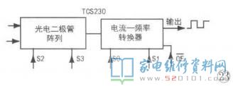 这些光电二极管交叉排列在芯片内部,组成8 X 8光电二极管阵列,最大限度地保证入射光检测均匀性,从而增加颜色识别的精确度。另一方面,相同颜色的16只光电二极管并联,均匀分布在二极管阵列中,以消除颜色的检测误差。光电二极管阵列识别彩色,然后通过电流-频率转换器将电流信号转换成方波,其频率与光强度成正比,如图23所示。