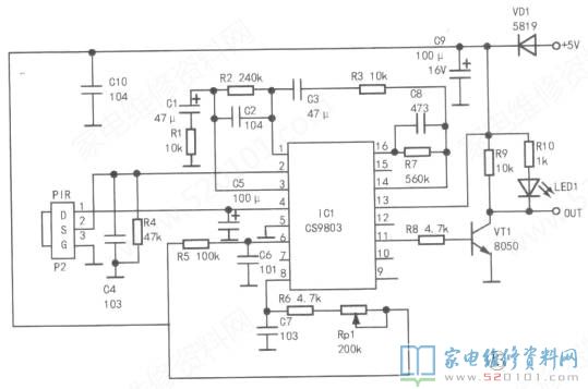 接通电源后,若热释电传感器检测区域内无人体,则CS9803(IC1)的⑪脚输出低电平,VT1截止,OUT端输出高电平(约4.4V);若检测区域内有人体,则热释电传感器将检测出人体发出的红外线辐射信号,并将其转换为电信号,送给IC1②脚。IC1中的第一级运算放大电路作为热释电传感器的前置放大器,将信号放大后从1脚输出,经过C3、R3加到⑭脚内的第二级运算放大电路进行放大,再经过IC1内双向鉴幅器检出有效触发信号,以启动延迟时间定时器,最后⑪脚输出高电平信号,VT1导通,OUT端输出低电平(0V),信号指示灯亮。