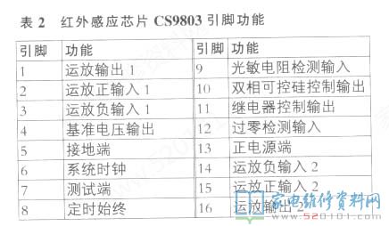 CS9803是常见的红外感应IC,内置时钟、比较器、检测器、计时器、过零检测和输出控制等电路,其引脚功能见表2。以CS9803为核心组成的热释电传感器电路如图15所示,其工作电压为4.5V~5.5V。