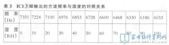 以HS1101型传感器为核心组成的湿度传感器电路如图17所示,其工作电压为4.5V〜5.5V。HS1101型传感器(DS1)与时基电路NE555(1C1)的触发端②、⑥脚相连,电位器Rp1用于校准输出频率。当IC1⑦脚电压达到阈值电压(0.67VCCM,DS1充电,IC1③脚输出高电平;当IC1⑦脚电压为低于0.33VCC时,DS1开始放电,1C1③脚输出低电平。如此周而复始JC1⑦脚输出方波信号。通过检测该方波的频率,即可得到当前的湿度,其对照关系见表3(测试温度为25°C)。