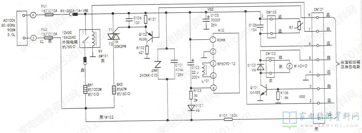 这款日本象印CV-DM30型电热壶,使用电源为AC110V,因错接AC220V电源而损坏。拆机观察,发现电路板局部已熏黑,压敏电阻ZNR(240NR-07D)已碎,部分铜箔脱落并熔化,电阻R103( 36Ω/2W )开路。实绘该机电路如图1所示。