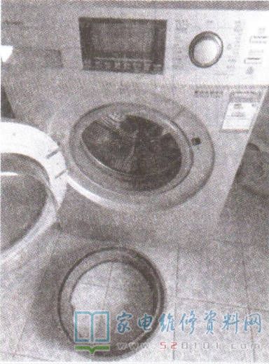 一台小天鹅TG70-1231E(S )型滚筒洗衣机,用户称,工作中有焦煳味,而且噪音极大。根据故障现象分析,初步判断轴承三脚架有故障。上门检查,转动内筒时发现,每转到一个固定点就有摩擦门封圈的现象。因该机已使用多年,征得用户同意,决定将轴承三脚架和门封圈全部换新。拆开盛水桶,取下有门封圈的部分,如图1所示。再次转动内筒,运转平稳无噪音。拆下前后两个轴承(均为进口轴承)目测,润滑油无变色现象,且转动灵活;三脚架无磨损痕迹,整体无异样,看来故障原因在门封圈中。换上新的门封圈试机,故障排除。