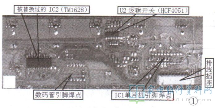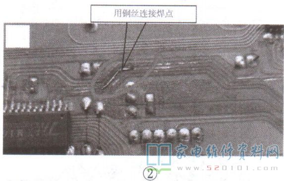 通电,测量面板上的电容EC3两端电压为5V,测量单片机IC1( N79A8211 )及驱动芯片IC2、8选1电子开关U2 (HCF4051) 的5V供电均正常。因该机各项功能正常,判断单片机正常,怀疑U2有问题,换新U2后故障依旧。仔细观察IC2引脚外接铜箔,发现IC2④脚外的一段铜箔(与IC1⑧脚相连)表面有污垢。清除污垢后,测量此段铜箔,已断路。该处铜箔断路后,IC2因④脚的STB选通信号丢失,而无法发出数码管驱动信号,故面板无显示。用细铜丝将断点连接起来,如图2所示。通电试机,故障排除。