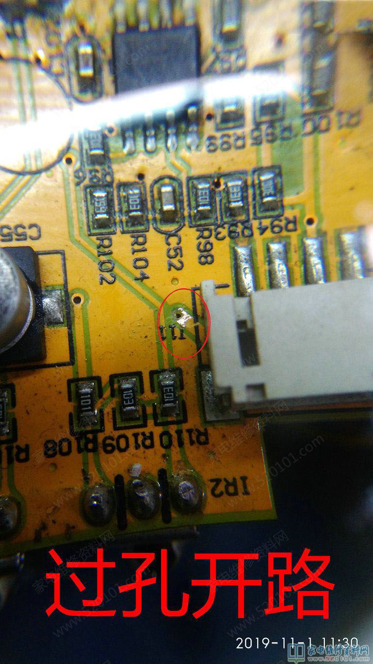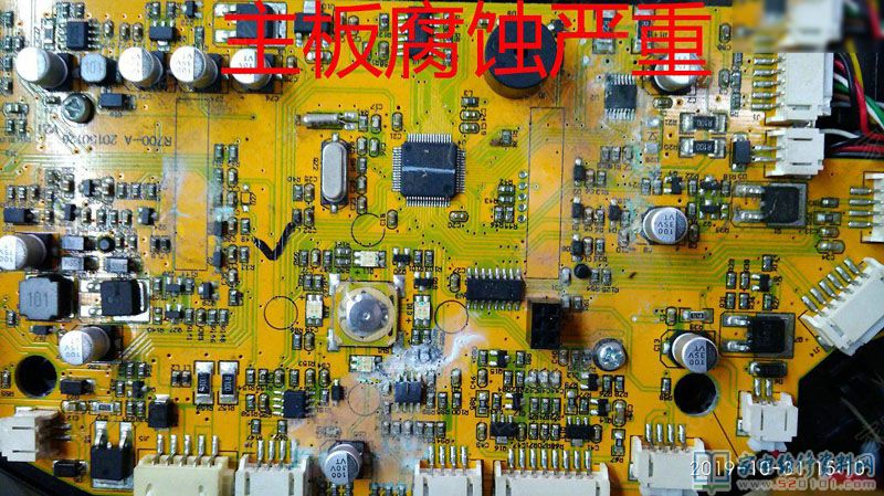接修一台科沃斯CEN360智能扫地机器人,故障表现为运动电机只直线后退不前进不转弯,但扫帚电机吸尘电机、遥控、面板操作均正常,拆机发现主板有大面积进水导致的腐蚀霉点,清洗后逐个测量发现几只腐蚀开路的电阻,更换后电机还是只后退,综合分析电机不前进原因可能性有以下3种。