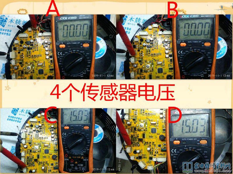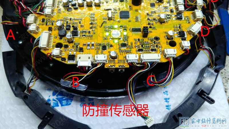 不正常时也会只后退不前进或拐弯运动,前方受阻传感器有同一型号A.B.C.D 4个,正常电压1=15V .2=14V .3=3.28V .4地,当撞壁时2.3脚输出电平送主芯片ARM 32F100运算后改变37-40脚输出电平,让控制A.B电机4954LPT得到前进后退拐弯指令改变运动轨迹 ,测得C.D传感器电压正常,A.B传感器电压均为0v,跑线路发现供电过孔霉断开路,短接后试机各功能恢复正常。