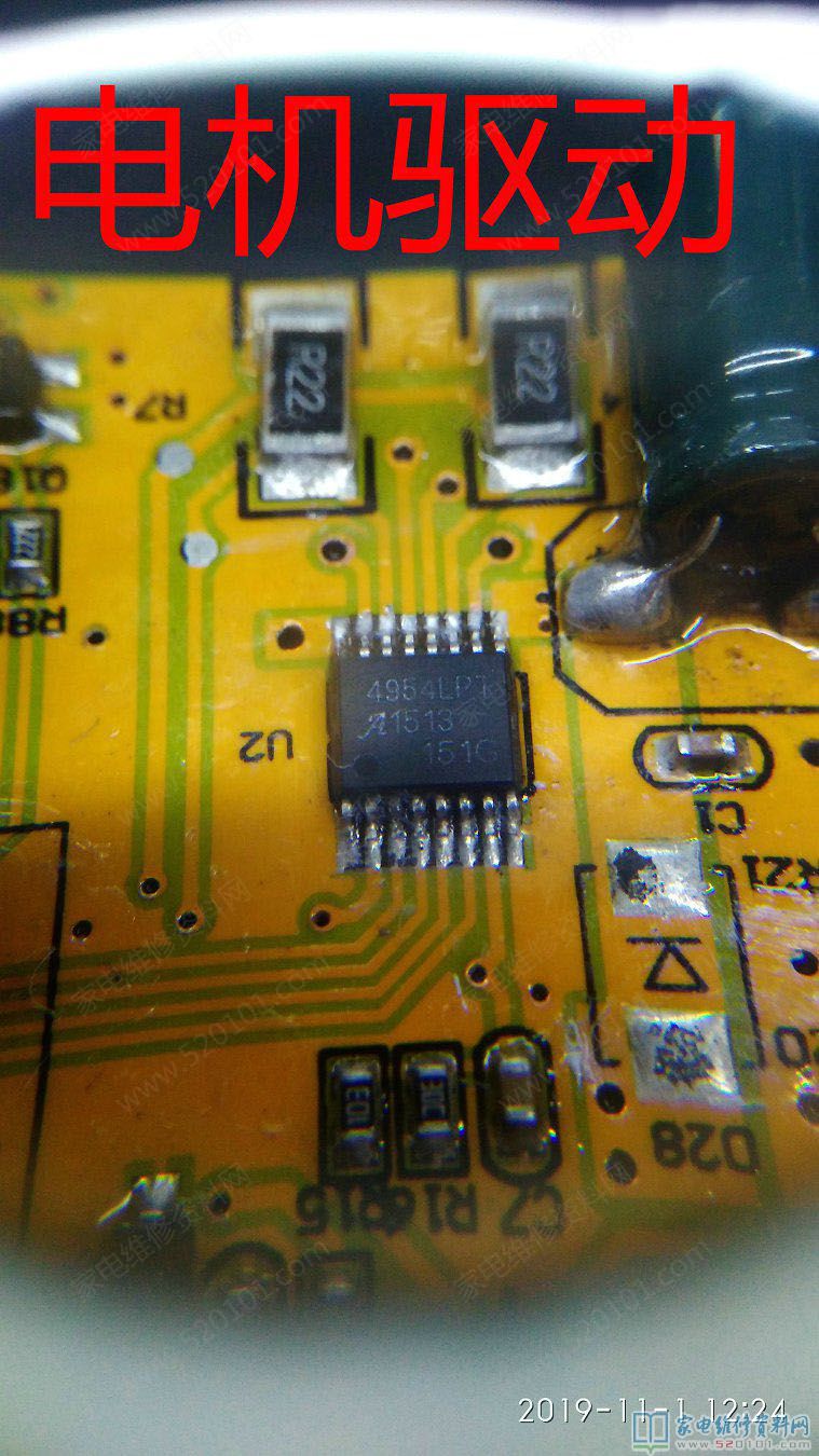 驱动输出脚37--40连接着4954LPT 3.4.5.6输入,电机停止时测得电平3.28v正常且平衡,因扫帚电机、吸尘电机、遥控、面板操作均正常,判定芯片正常。