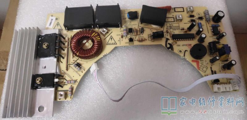 接修一台九阳C21-SC007型电磁炉,通电后接触功能与显示均正常,但不加热。首先检查取样电阻,发现R401开路。从色环来看,该电阻的阻值应是470k,于是将其换新。再检查机器,发现该机电路板上有多处发霉、生锈,用小刀清除发霉生锈点后试机,仍不加热。检查5pF/275V、2uF/275V及0.24uF/1200V电容,均正常。仔细观察故障现象,发现放锅后显示正常,但没有启动声,判断故障部位在IGBT管及前级驱动电路中。经查,驱动电路中的一只S8050型三极管一脚已锈断。将其换新后试机,故障排除。