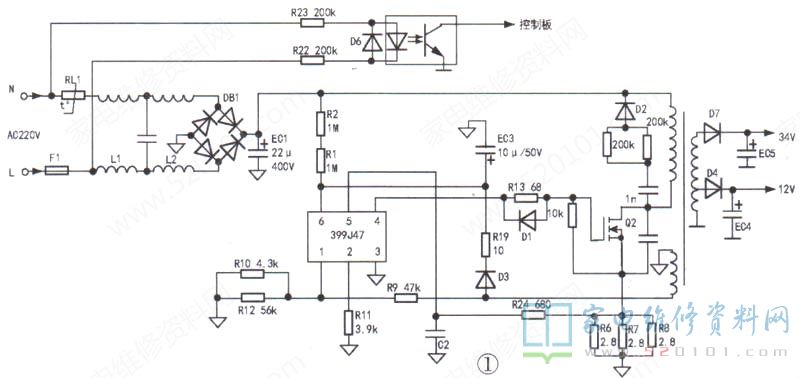 一台德尔玛DEM-SJS100型空气加湿器,其电源板中间区域被烧黑。该机6脚电源芯片丝印号为399J47,实绘其电路如图1所示。上电后AC220V交流电经RL1、L1.L2限流并滤除变频干扰,再由DB1桥式整流EC1滤波,得到300V直流电压。300V电压经R2.R1降压后给芯片⑥脚外接电容EC3充电,当⑥脚电压达到阈值后,芯片④脚发出驱动脉冲,开关管Q2开始工作,开关变压器辅助绕组的感应电压经D3整流、EC3滤波后,供给芯片⑥脚,以取代启动供电。开关变压器的次级感应电压分别经D4.D7整流及EC4.EC5滤波后,形成12V和34V电压,前者供给控制芯片和小风机,后者供给水雾发生器。