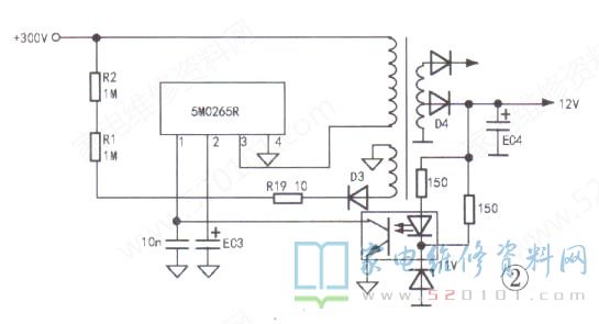 因笔者手头没有该型6脚芯片,尝试用电源模块5M0265R代换,为提高稳压精度,在电源次级12V输出电压端外接11V稳压二极管进行取样,其取样信号经光耦反馈到5M0265R的④脚,如图2所示。该加湿器整体功耗约25W,由于需要连续长时间工作,因比在5M0265R.上加装-一个小型散热片。改装后试机,一切正常。须注意的是,原机线路板上也有一只光耦,但这只光耦并不是起稳压反馈作用,从线路结构来看,应该是用于过零检测,使次级负载受220V交流电的过零信号触发控制。实修中曾断开该过零信号,整机不工作。