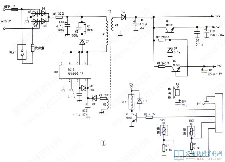 韩酷智能电饭煲采用开关电源电路,输出12V、5V电压,其实绘电路如图1所示。220V市电通过磁钢内温度保险后,加到由二极管D1~D4组成的全桥上,经全桥整流和电容EC1滤波,产生约300V直流电压,通过开关变压器T1的初级绕组N1加到IC1(AFADD3.1A)⑤~⑧脚,电路起振。T1产生的感应电压经电阻R3限流、二极管D5整流、电容EC2滤波,产生约16V直流电压,作为IC1的二次供电。电容C2、电阻R2、二极管D7组成尖峰吸收电路。T1次级N3绕组两端产生的感应电压经二极管D6整流、电容EC3滤波,产生12V直流电压,一路供给继电器,另一路供给由Q2.Q3.D9等元件组成的串联稳压电路,在电容EC8上产生5V直流电压,供给蜂鸣器及面板;在电容EC5上产生5V直流电压,供给磁钢及锅盖温度检测电路。
