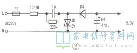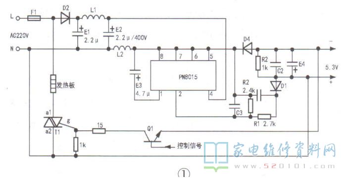 ⑤~⑧脚是内部开关管的S极。在工作中,当开关管截止时,会在L2上产生一个反电动势,该电动势经D4整流、E4滤波后供给电脑板。开关管的S极内接-只电流取样电阻,当通过开关管的电流过大时,芯片进入过流保护状态。由于该电源只有- -组电压输出,且冷热地没有隔离,加之笔者手头无PN8015,于是决定用电容降压电路代替(在半波整流电路中,1uF电容约对应30mA电流输出)。由于整流二极管D4存在电压降,所以稳压管ZD的稳压值选为6V(比输出电压高0.7V),降压电容的容量直接影响输出电流,考虑到该电源功耗,决定采用1uF的降压电容,如图2所示,功率不小于0.25W。双向可控管T1的g极受Q1控制,当电脑板发出高电平加热控制信号时,Q1导通,T1的g极通过导通的Q1接5.3V电压的负端。由于T1的a2极接5.3V电压的正端,即T1处于负向触发状态,a1、a2之间导通,发热板得电工作。