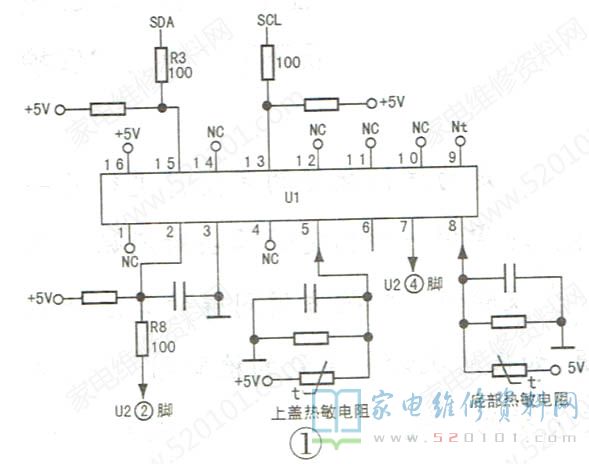 接修一台九阳JYF-I30FS07电饭煲,上电后有时显示“E5"代码,有时无反应。查询资料得知,“E5”表示上盖热敏电阻故障。上盖热敏电阻在常温下(25°C) 的阻值为100k,温度升高后,该电阻阻值变小。检测上盖热敏电阻,正常,判断是控制板有问题但换新后故障依旧。实绘相关电路如图1所示。