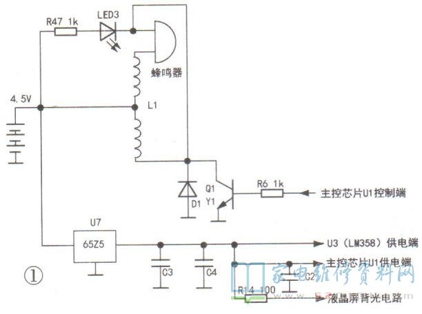 该机电路主要由一氧化碳浓度检测电路主控电路和浓度显示及声光报警电路构成,传感器将一氧化碳浓度信号转化为电信号,经运算放大后传送给主控电路。电池提供的4.5V电源,一路直接供给蜂鸣器和红色发光二极管LED3构成的声光报警电路,如图1所示;另一路经U2(65Z5)稳压后供给主控芯片U1、液晶屏背光电路、运放电路U3(LM358)。测U2输入端电压为4.5V,但输出端电压仅为0.2V,而正常值为3V。断电,测U2输出端对地电阻为1.1k,无短路故障,判断U2损坏,换新后故障排除。